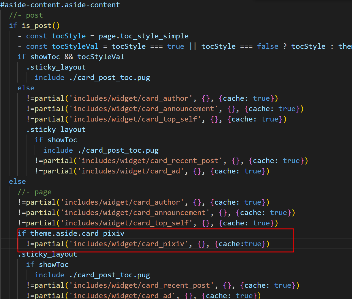 iframe(src="https://cloud.mokeyjay.com/pixiv/" loading="lazy" data-rocket-lazyload="fitvidscompatible" data-ll-status="loaded" frameborder="0" style="width:99%;height:380px;margin:0;") - 2.在项目目录/themes/layout/includes/widget/index.pug中,在你想要的位置加入如下代码我加上的地方plaintext